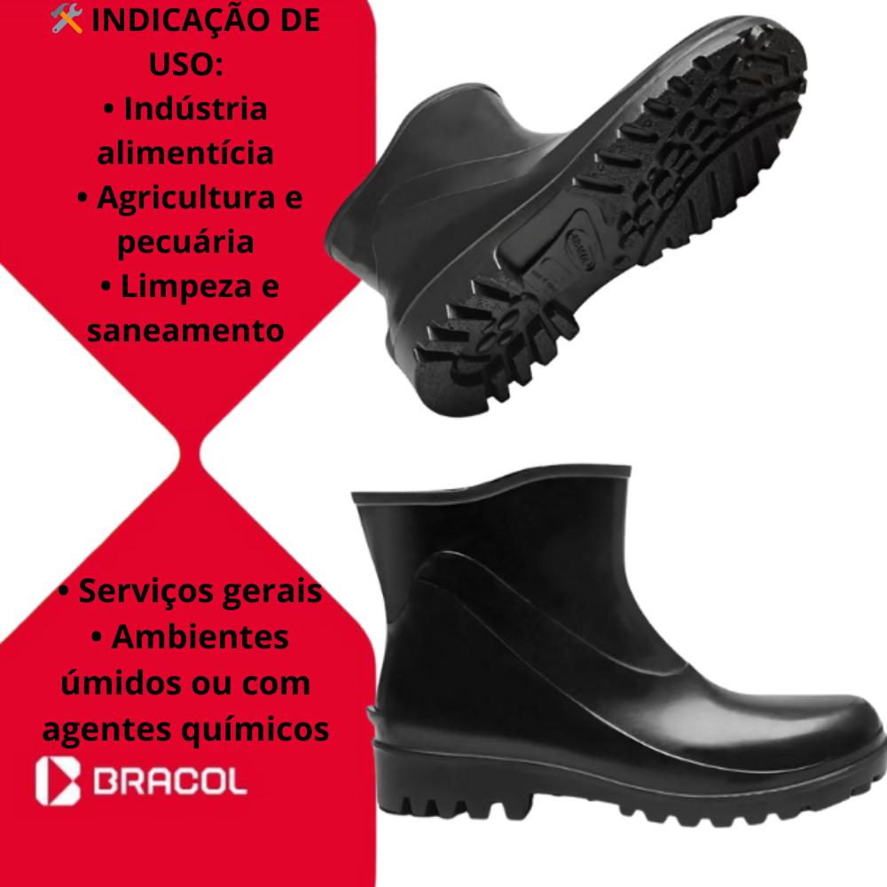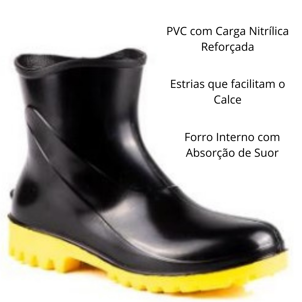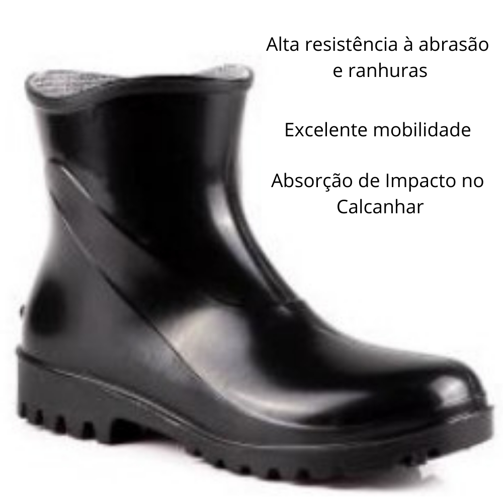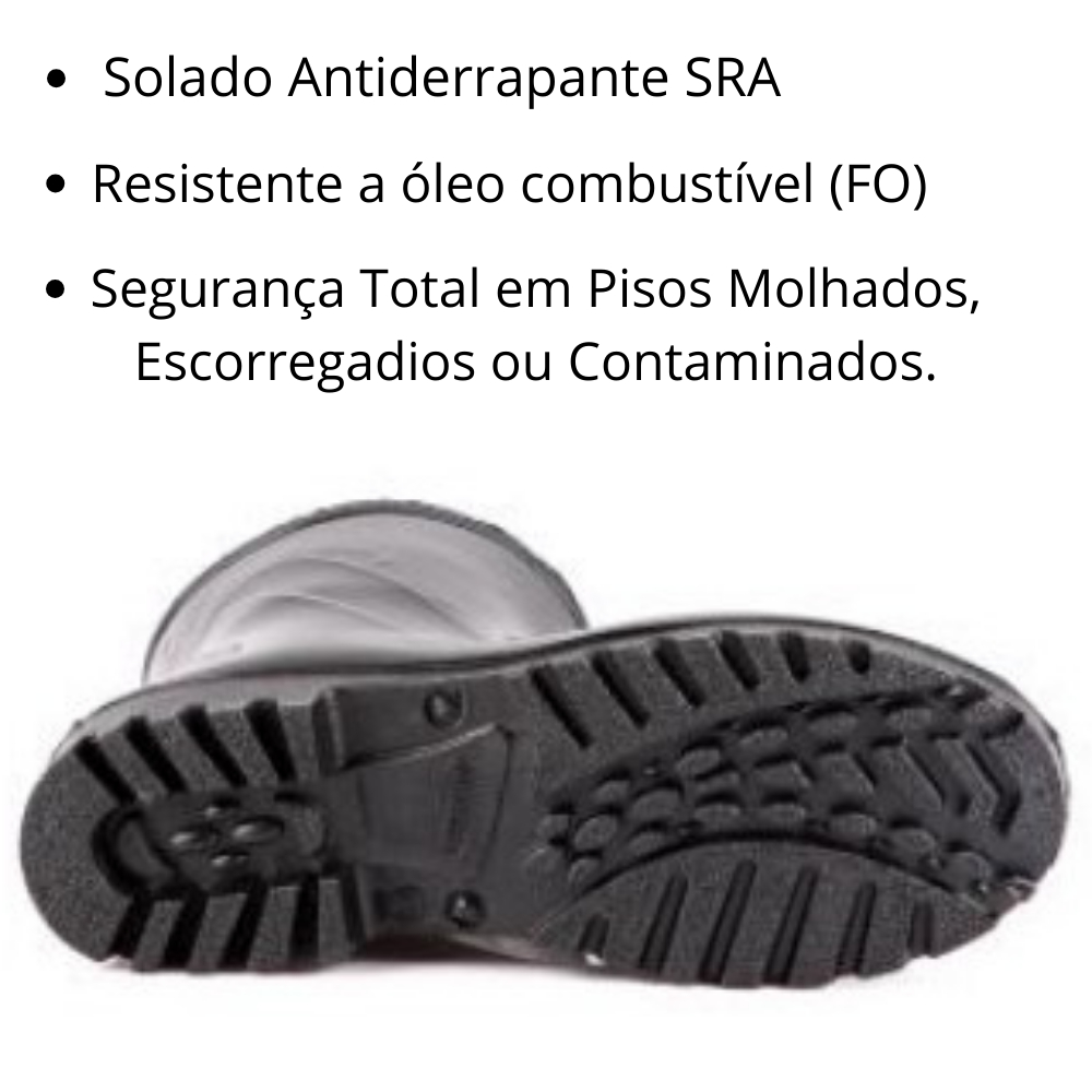Seu cano extra curto garante mais mobilidade, enquanto as estrias laterais e traseiras facilitam o calce no dia a dia. O solado antiderrapante SRA, com absorção de impacto no calcanhar (E) e resistência a óleo combustível (FO), proporciona segurança total em pisos molhados, escorregadios ou contaminados.
