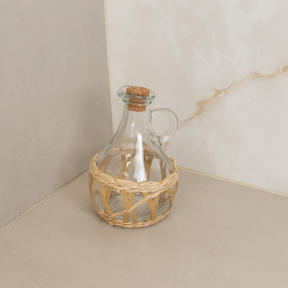 Produzida em vidro transparente, a garrafa permite visualizar o conteúdo com facilidade, enquanto a fibra natural e a tampa em cortiça trazem um toque rústico-chique que valoriza a bancada, a mesa posta e a cozinha como um todo.