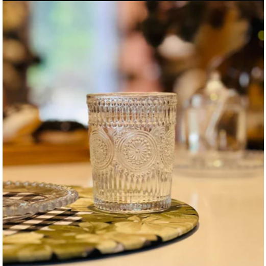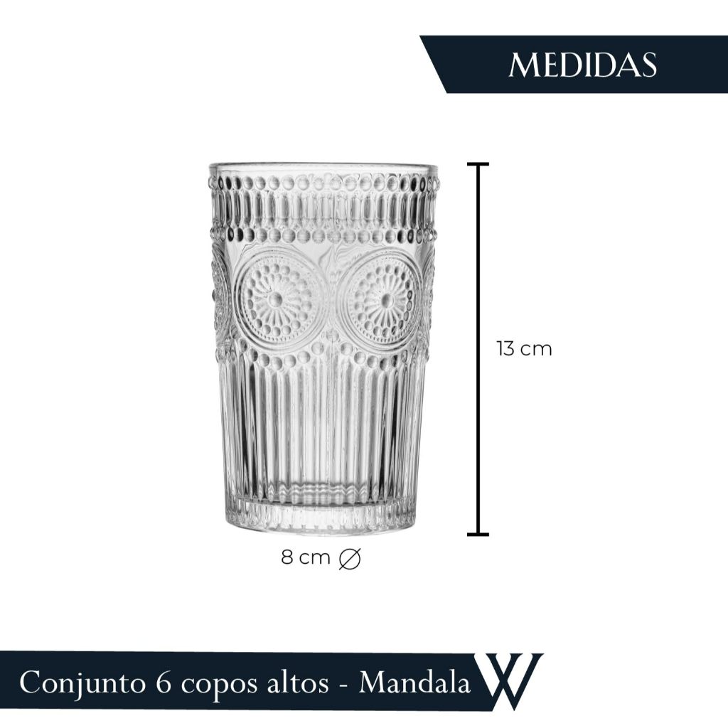 O Copo Mandala 260ml da Wolff é uma peça de vidro transparente, elegante e funcional, com design exclusivo que apresenta um relevo em formato de mandala, ideal para servir sucos, coquetéis e outras bebidas, adicionando sofisticação ao dia a dia ou eventos especiais, sendo lavável com detergente neutro e esponja macia para preservar sua beleza.