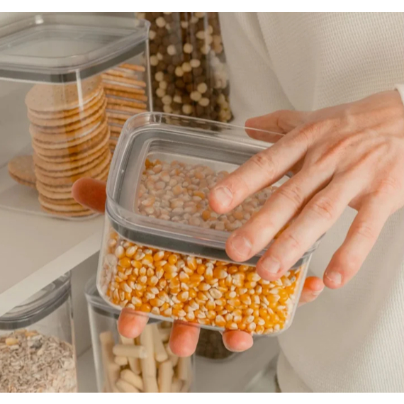 Com tampa hermética ele preserva o conteúdo contra umidade, odores e insetos, enquanto o formato retangular otimiza o espaço e permite empilhar com segurança.
